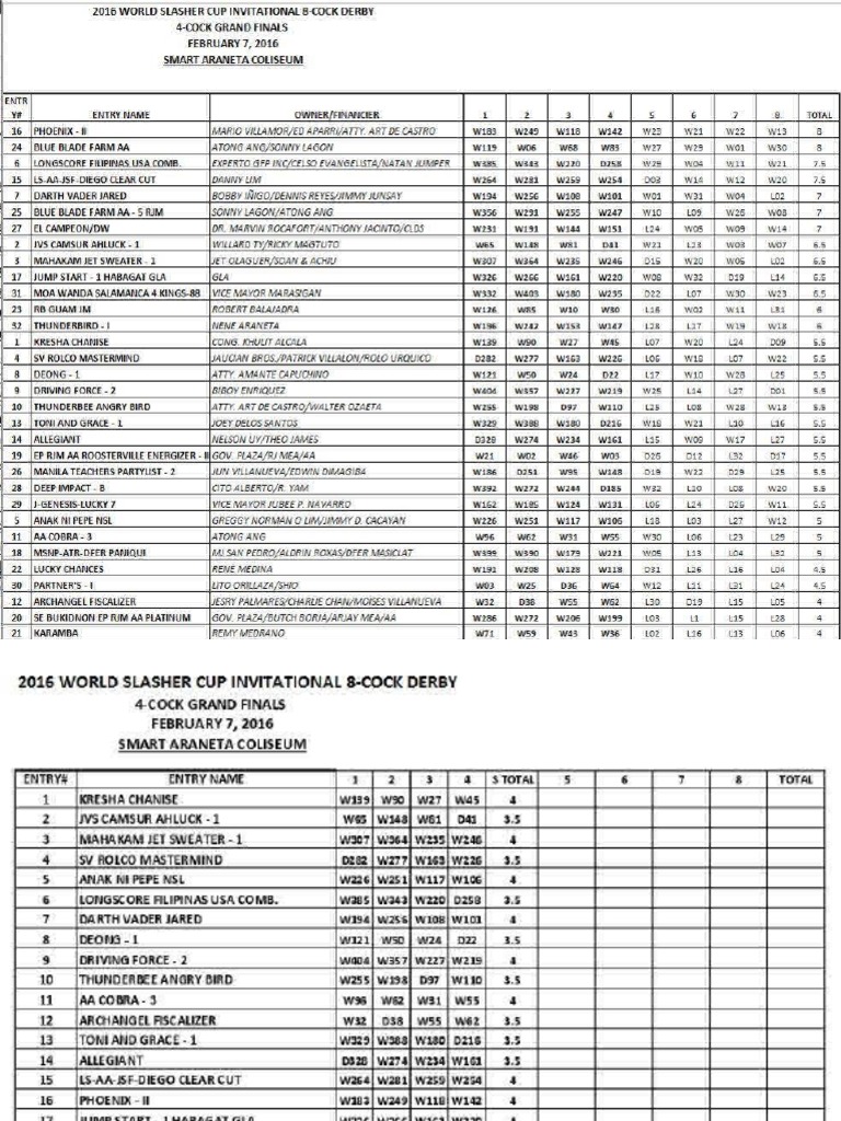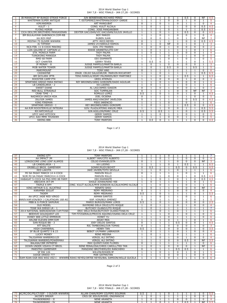 January 27 2020 by admin. 2014 World Slasher Cup 2 Results - SORTED - Free download as PDF File pdf Text File txt or read online for free. The longest running most prestigious most anticipated and biggest cockfighting event in the world.